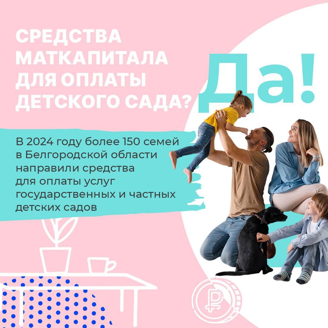 В 2024 году 166 семей Белгородской области воспользовались материнским капиталом для оплаты услуг государственных и частных детских садов. Всего 166 семей воспользовались этой возможностью. Заявление на использование материнского капитала можно подать сразу после рождения ребёнка, который даёт право на получение сертификата. При этом не имеет значения, какой это ребёнок по счёту в семье. Задать вопрос можно в единый контакт-центр по бесплатному номеру: 8-800-100-00-01.